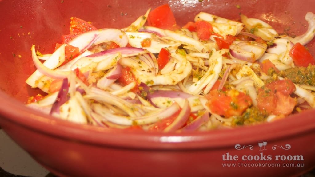 - Add the onions, garlic and tomatoes and saute for 2 minutes, or until just starting to soften. Mix in the remaining chermoula marinade.